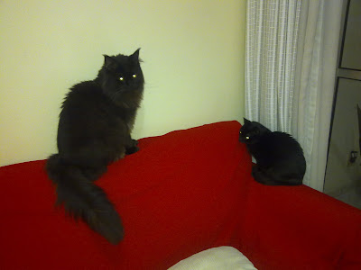 Eu sempre ouvi falar da raça Maine Coon e ficava impressionada com o tamanho dos peludos. Já cheguei a desconfiar que pudesse ser montagem de Photoshop ou sei lá o que. Me intrigava como eu bicho tão enorme era descrito como extremamente dócil Essa semana uma grande amiga, a Luisa, estava desesperada, dormindo na sala para que o Antônio ficasse no seu quarto. O Totô é um Maine Coon preto lindão de um amigo dela e está passando uns dias de "férias" pois seu dono está viajando. Todo mundo sabe que eu tenho uma gata exclusivista, ciumenta e possessiva, mas não tinha como não oferecer uma mão...